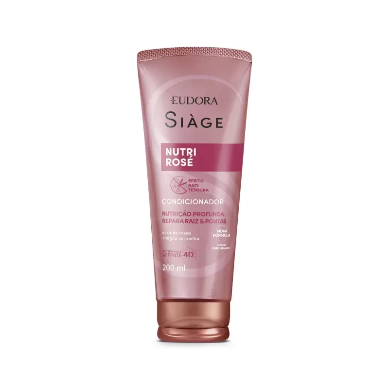 O Condicionador Eudora Siàge Nutri Rosé 200ml é um tratamento capilar de alta performance que oferece nutrição profunda, reparação dos danos e prevenção da quebra. Sua fórmula inovadora contém o exclusivo Elixir de Rosas, que proporciona um cuidado luxuoso e eficaz, devolvendo a resistência natural dos fios. Com o efeito anti-tesoura, evita pontas duplas e reduz a necessidade de cortes frequentes. Além disso, desembaraça instantaneamente, sela as cutículas e mantém o couro cabeludo equilibrado. Possui textura cremosa, fragrância sofisticada e embalagem prática de 200ml. Indicado para todos os tipos de cabelo, especialmente os porosos e danificados.