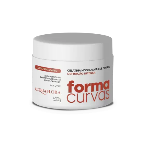 A Gelatina Modeladora de Cachos Acquaflora Forma Curvas Definição Intensa 500g foi desenvolvida especialmente para cabelos ondulados, cacheados e crespos. Sua fórmula combina Ácido Hialurônico com extratos de Chia e Linhaça, promovendo hidratação profunda, definição duradoura e controle do frizz. O produto é vegano, livre de sal, parabenos, óleo mineral, silicones e corantes, sendo ideal para técnicas Low Poo e No Poo.