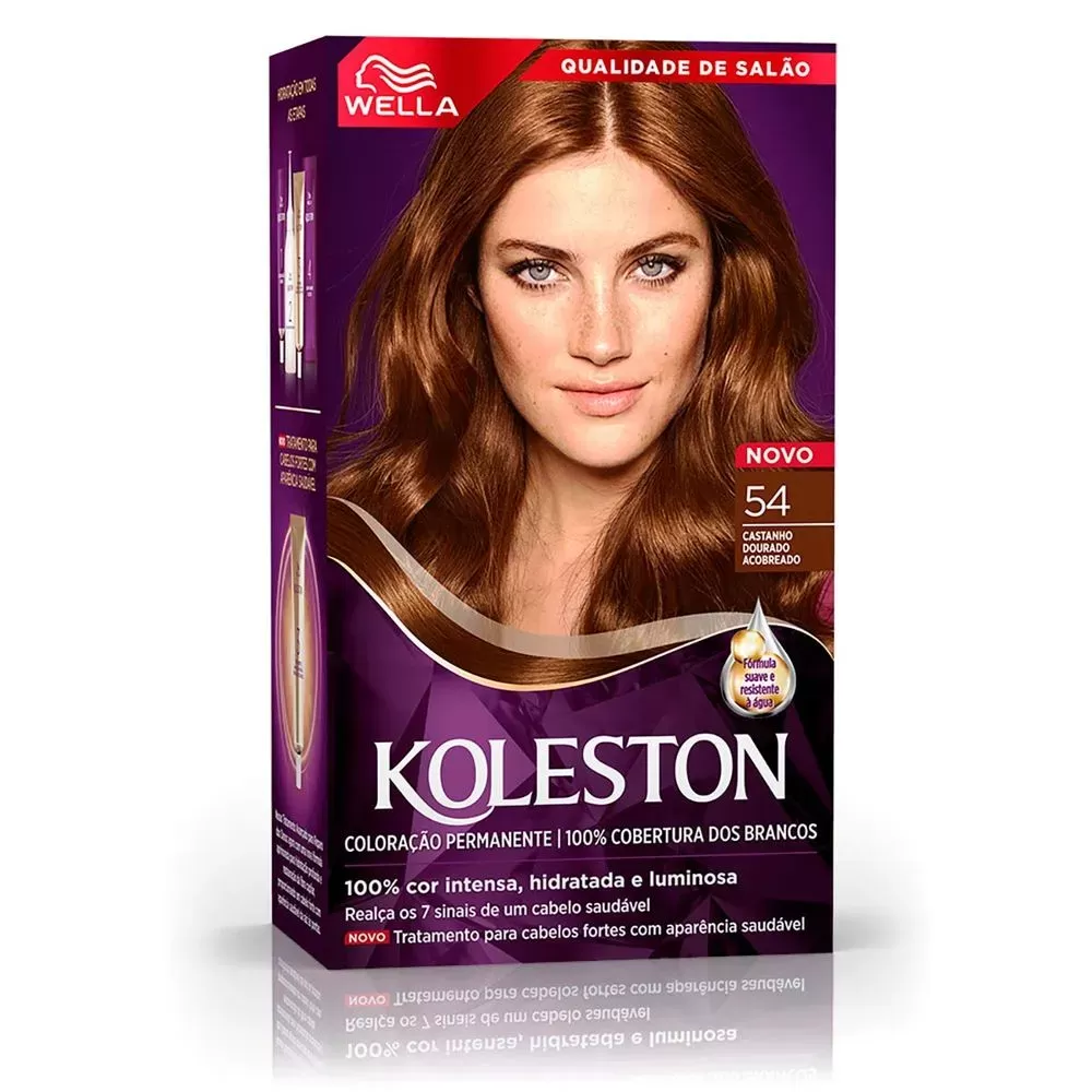 A Koleston Tintura 54 Castanho Dourado Acobreado serve para colorir os cabelos de forma permanente, oferecendo cobertura completa dos fios brancos e realçando a beleza com um tom castanho dourado acobreado vibrante e luminoso. É indicada para quem deseja durabilidade da cor, hidratação e brilho intenso.
