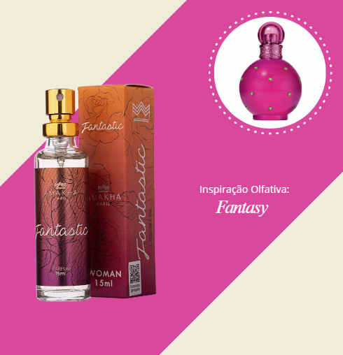 O Perfume Amakha Paris Fantasy 15ml é uma fragrância feminina da família olfativa floral gourmand, perfeita para mulheres que valorizam o romantismo e a delicadeza. Inspirado no icônico Fantasy de Britney Spears, combina notas florais com acordes doces como baunilha, caramelo e frutas vermelhas, criando uma experiência sensorial envolvente e acolhedora. Ideal para uso diurno e noturno, especialmente nas estações mais frias. A embalagem spray de 15ml é prática e ideal para levar na bolsa. Produto nacional, livre de crueldade animal.